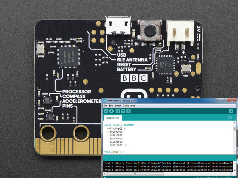 ここまでの設定が正しく行われたことを確認します。[ファイル]>[スケッチ例]>[Adafruit microbit library]>[matrixdemo] を読み込んで micro:bit に書き込んでください。LEDアレイの表示デモプログラムが走れば正常です。BLEについては後の演習で行います。